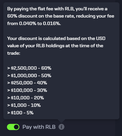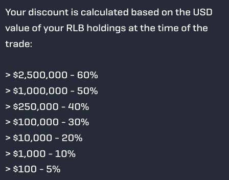 RLB can now be used to cover trading fees & unlock discounts of up to 60% on fees under the Flat Fee structure based on the USD value of the users' RLB holdings at the time of the trade!