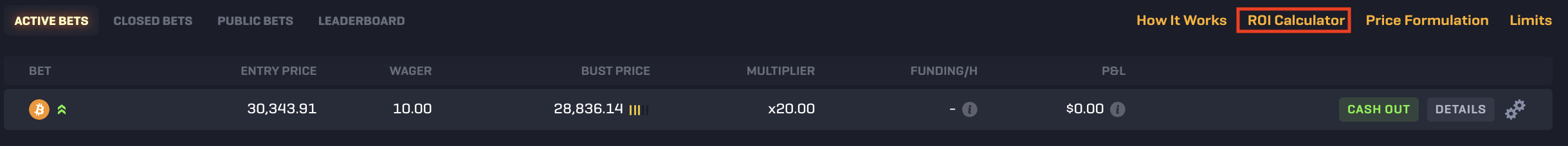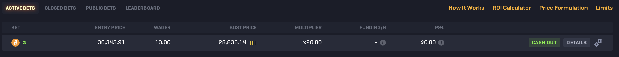 Upon placing your bet, the open trade will appear beneath the chart under the 'Active bets' tab. Here, you will be able to see the entry price, the amount you have bet, the bust price at which your bet would lose, your chosen leverage, the funding payments you may need to pay, and also your current profit and loss for the trade!