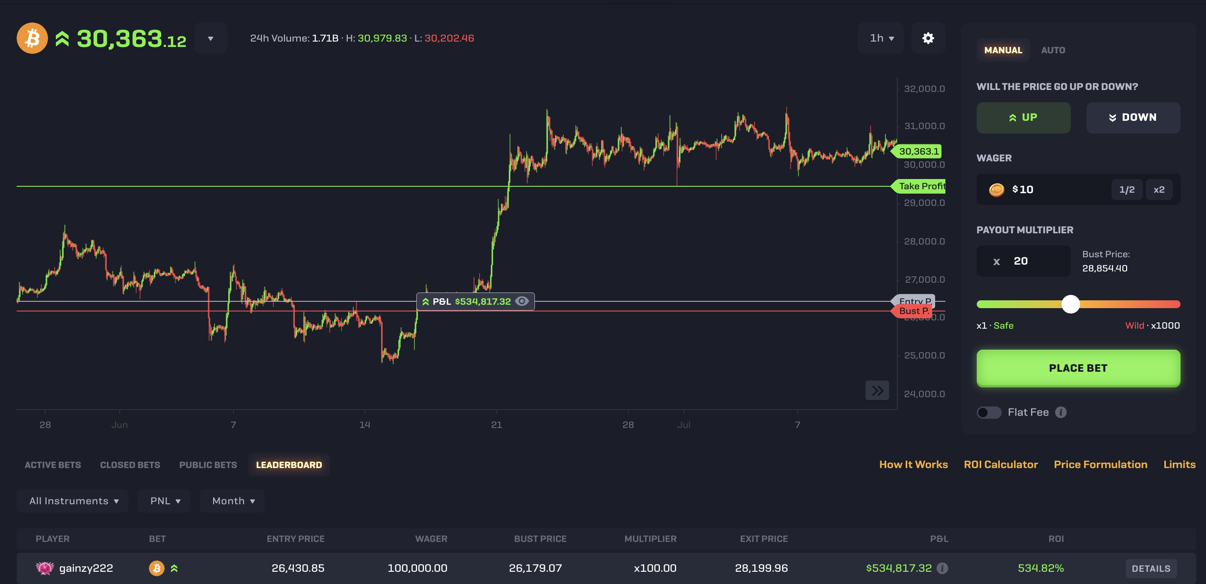 To place a bet, simply select whether you think the price of the cryptocurrency will go 'Up' or 'Down', enter your chosen leverage (up to 1000x!) and then click 'Place Bet'.