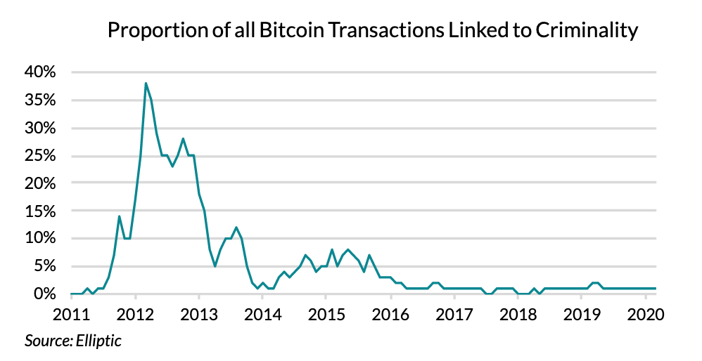 Because of Bitcoin's transparent nature, a whole industry of blockchain analytics has sprung up and developed sophisticated techniques to trace criminal activities related to cryptocurrencies. Data from blockchain analytics firm Elliptic shows that the share of Bitcoin’s market associated with illicit activities has fallen over time, from a peak of 35% of all transactions in early 2012 to less than 1% at present.