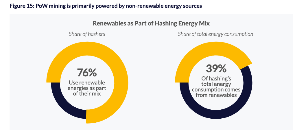 Also, Bitcoin is actually a lot greener than people think. According to estimates from the 3rd Global Cryptoasset Benchmarking report by the Cambridge Center for Alternative Finance, 76% of miners use renewable energy (especially hydroelectric power) as a part of their energy mix, and 39% of their total energy consumption is derived from renewables:
