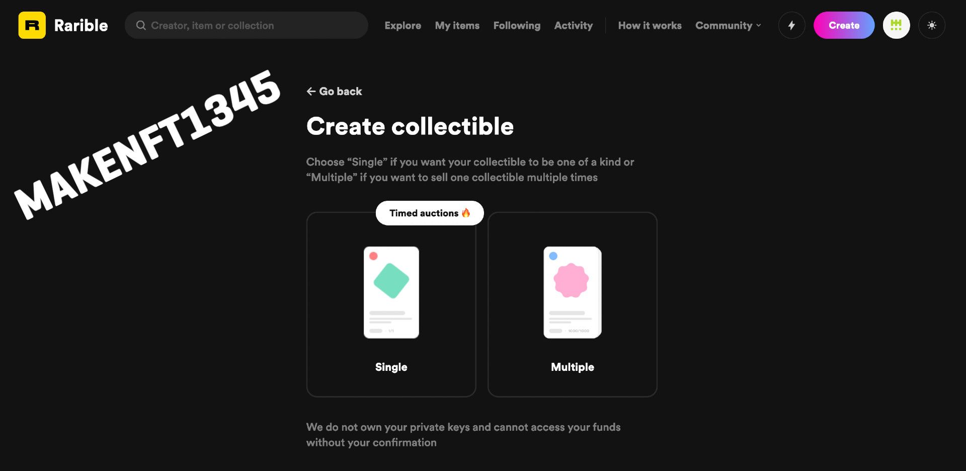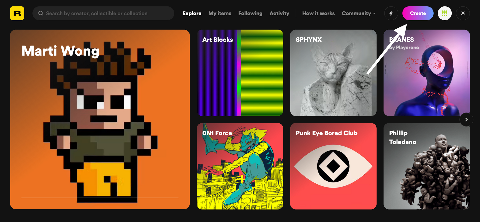 Once your wallet has been connected, click on the 'Create' button on the top right-hand side of Rarible's homepage: