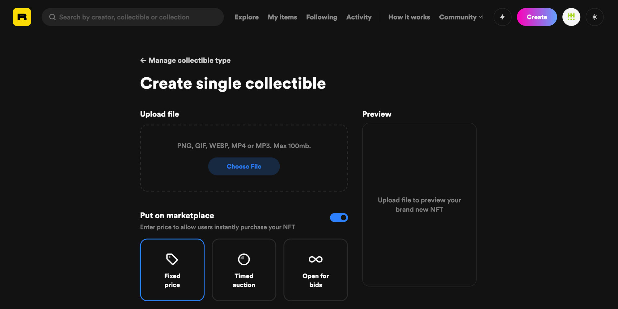 Once your file has uploaded, a preview will be shown on the right-hand side. Then you can decide on the way someone will purchase the NFT: for a fixed price, through a timed auction, or just leave it open for bids. On Rarible, you can price your NFT in terms of ETH, DAI, USDC, RARI and many other tokens. Note that once your NFT is sold, the Rarible marketplace charges a 2.5% service fee.