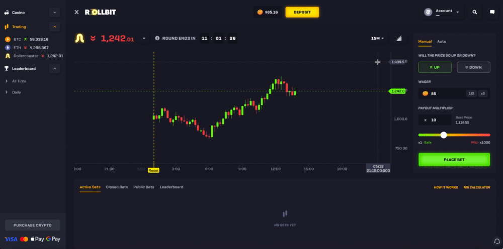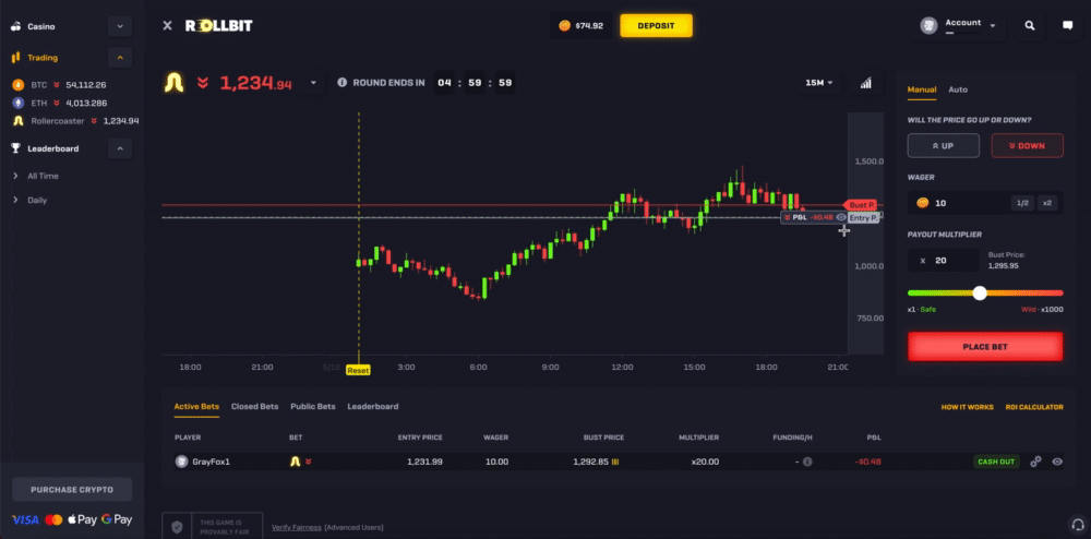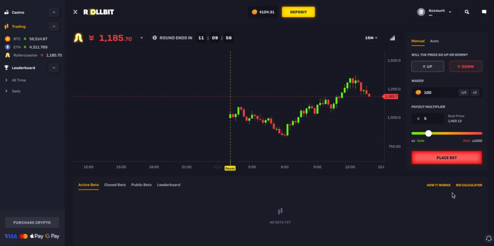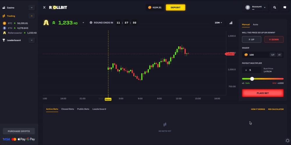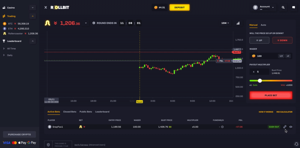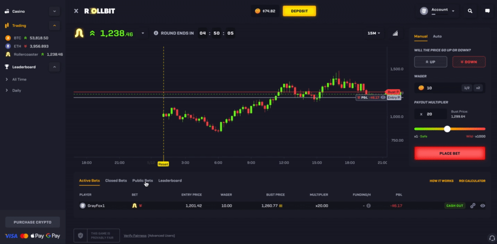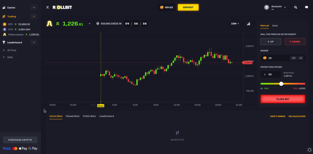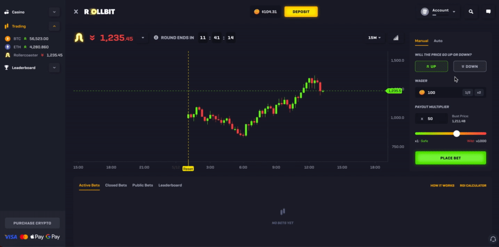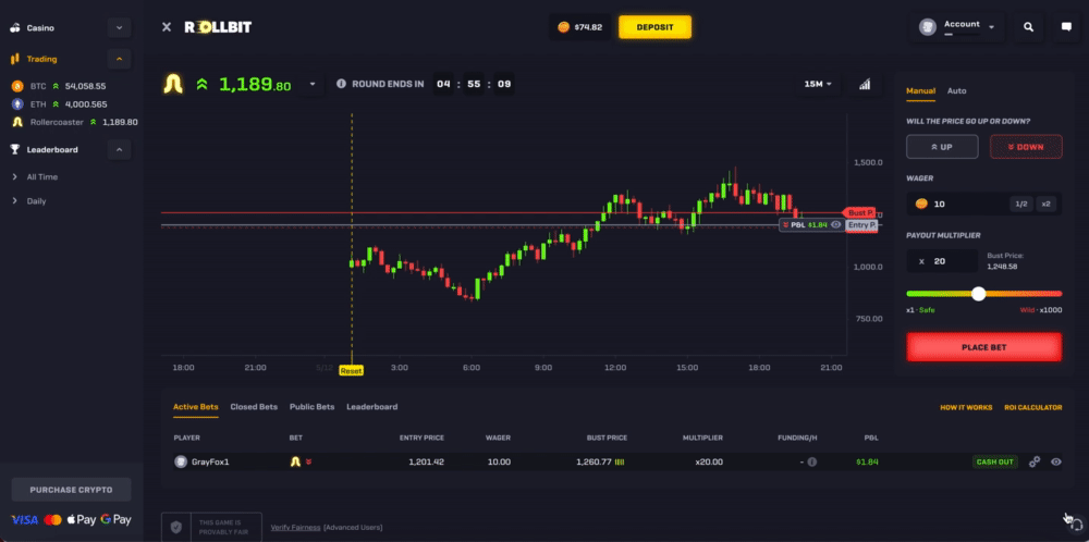 Rollercoaster is an exciting betting game unique to Rollbit where you can wager on whether the randomly generated price will go up or down - think of it as simulated trading but with much higher volatility.