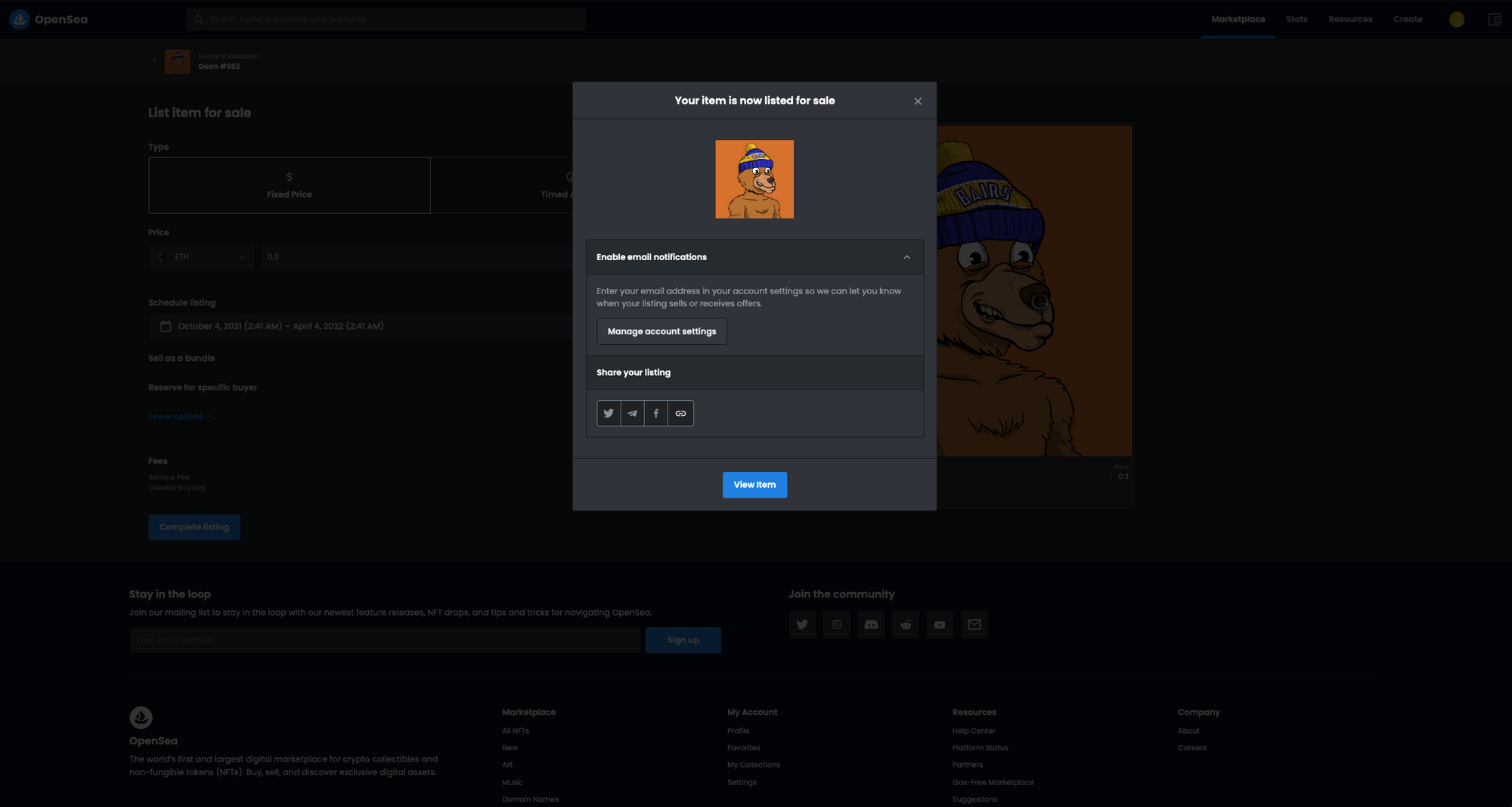 You can always cancel the listing or lower the price. However, cancelling the listing will require another transaction on the Ethereum network, which comes with a fee. From the listing page, you can also share it by copying the link or publishing it via social media.