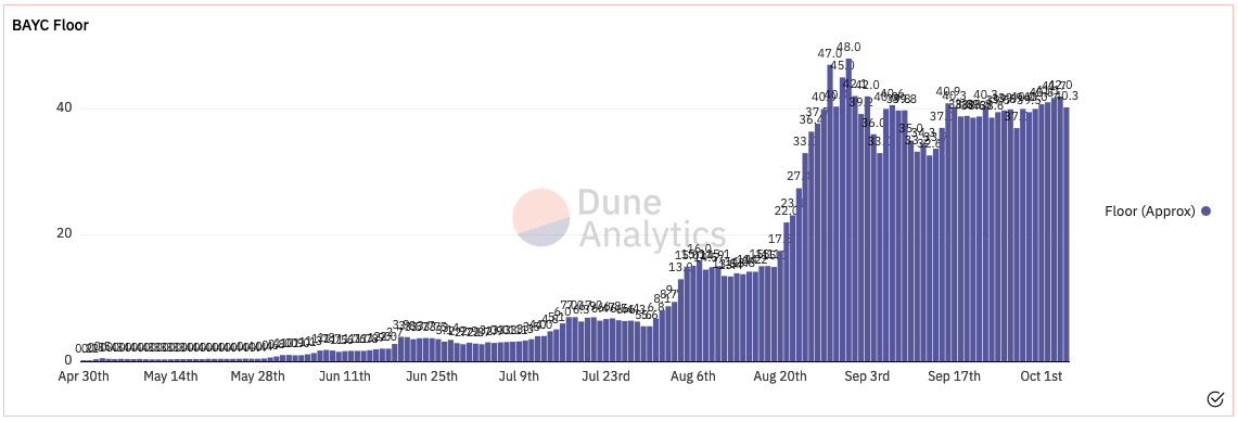 The Bored Ape Yacht Club (BAYC) floor price is illustrated in the chart below. According to these estimates, if you want to purchase a BAYC, you should look to buy one for a price of 40.3 ETH (or below this price if you manage to find anything on offer). Similarly, if you want to sell a BAYC NFT, you should not list it for anything less than the floor price, which in this case is 40.3 ETH.