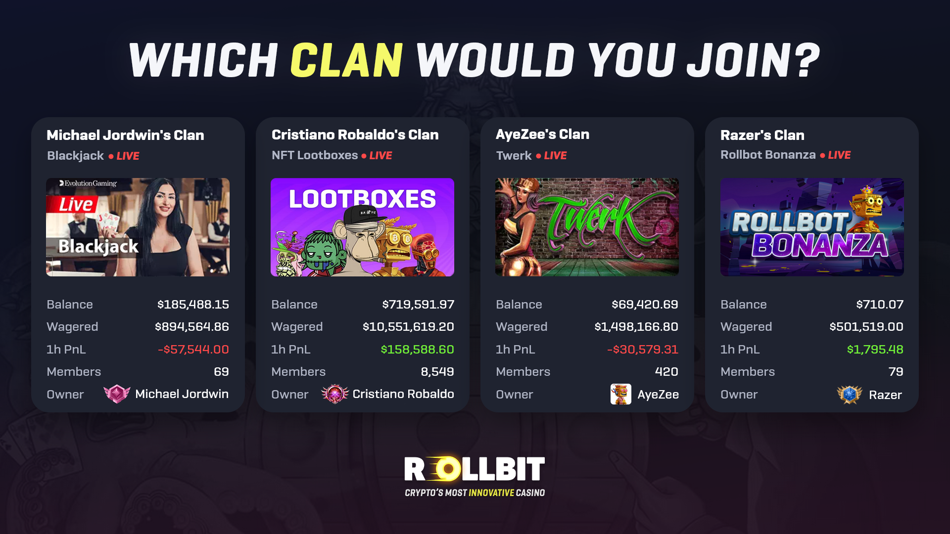 Rollbit's Clans are now the middleman for participants who want to wager in groups and share their wins with the shared balance updating in real-time.