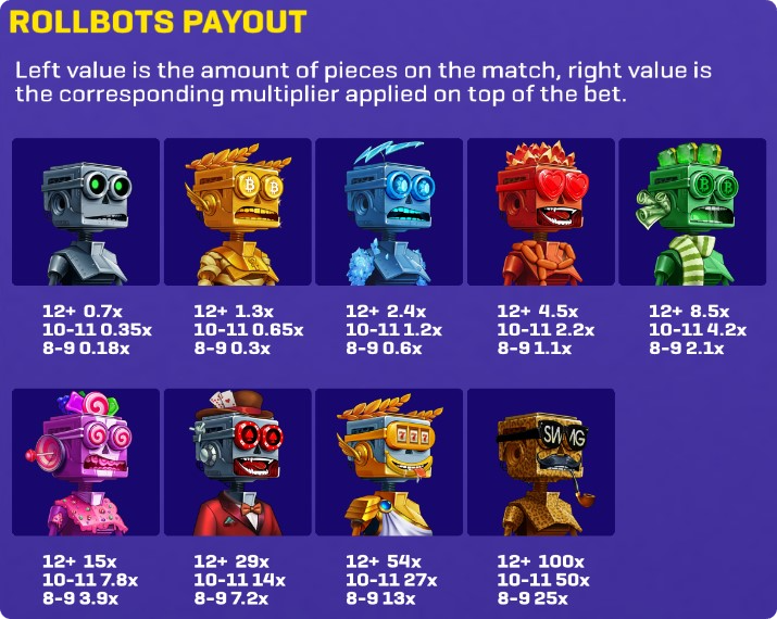 Inspired by our Rollbot NFTs launched in late 2021, the slot gives a new experience allowing the players to choose their own odds and volatility through picking the traits used for multipliers that are applied to each winning outcome.