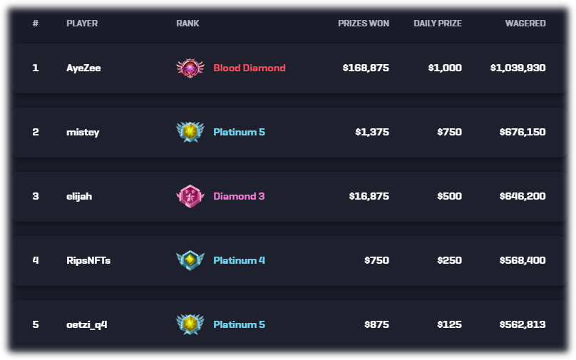 Everyday, Rollbit rewards the top 5 wagered players prizes from $125 to $1,000.