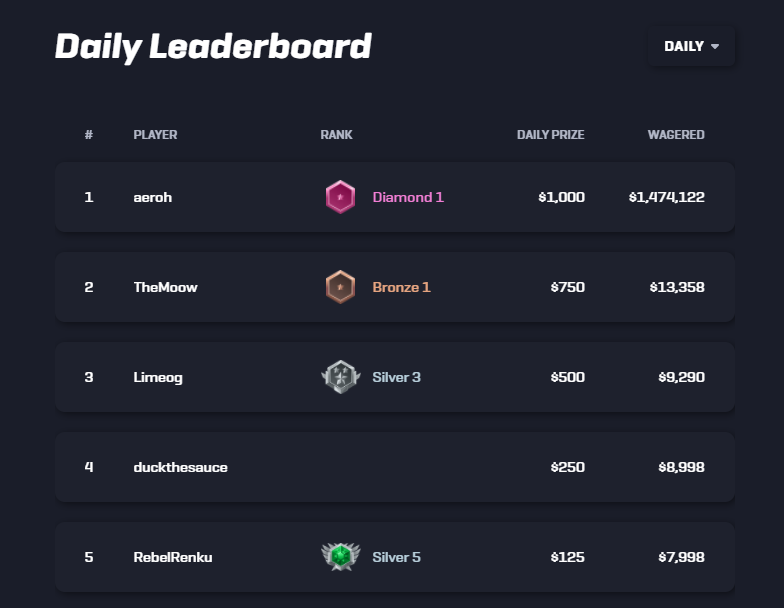 In addition to our All Time leaderboard, we now have a daily leaderboard with more than $2,500 in prizes!