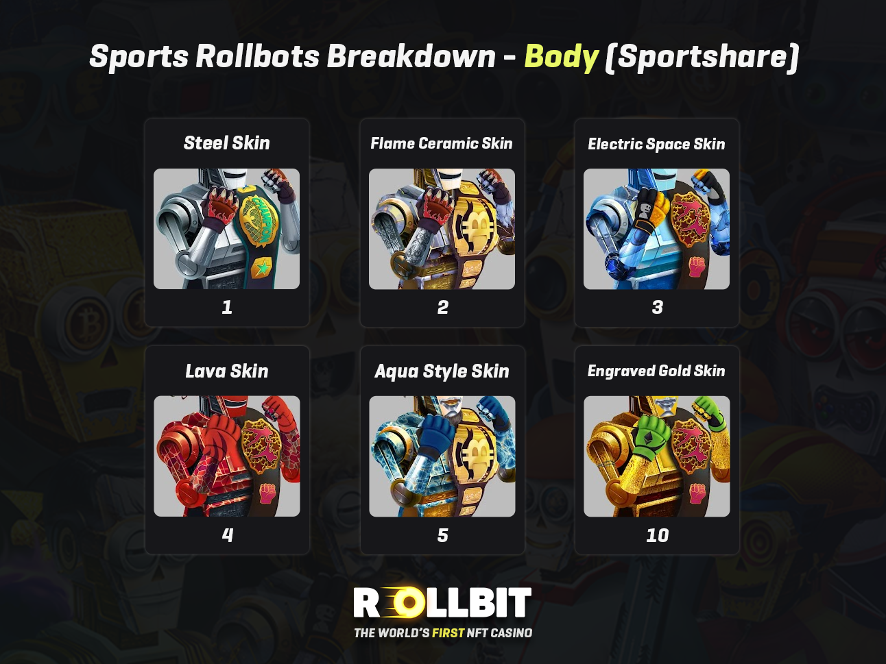 The body trait rarity of a Sports Rollbot determines the Sportshare for each Sports Rollbot as shown below and in the trait rarity breakdown in our whitepaper.