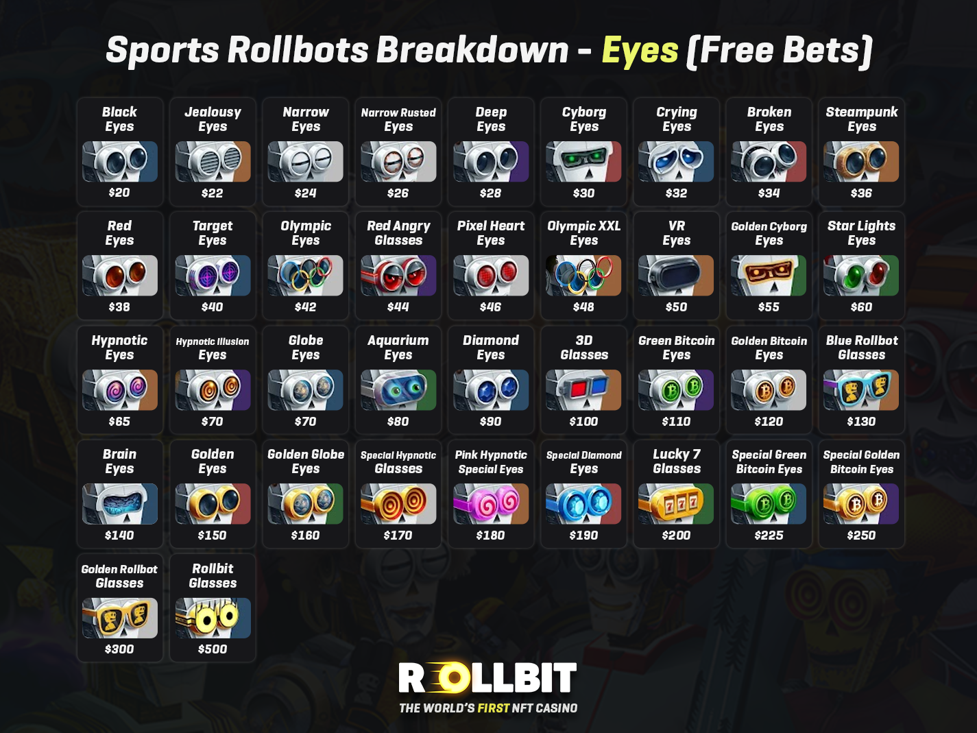 For each Sports Rollbot there is a free bet ranging from $20 all the way up to $1000 based on the rarity of the eye trait. You can use the free bet once per Sportsbot per month, meaning you can utilize up to 30 free bets a month!