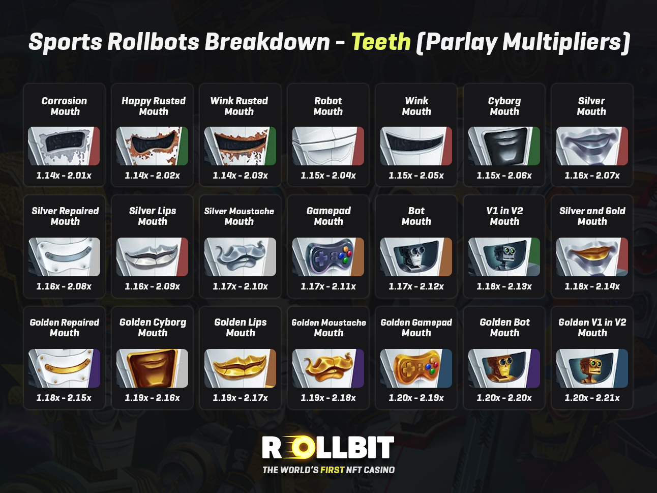 As with the free bets and profit sharing, the combo boosts for each Rollbot are different depending on a trait rarity, with the combo boosts' being influenced by the teeth trait rarity.