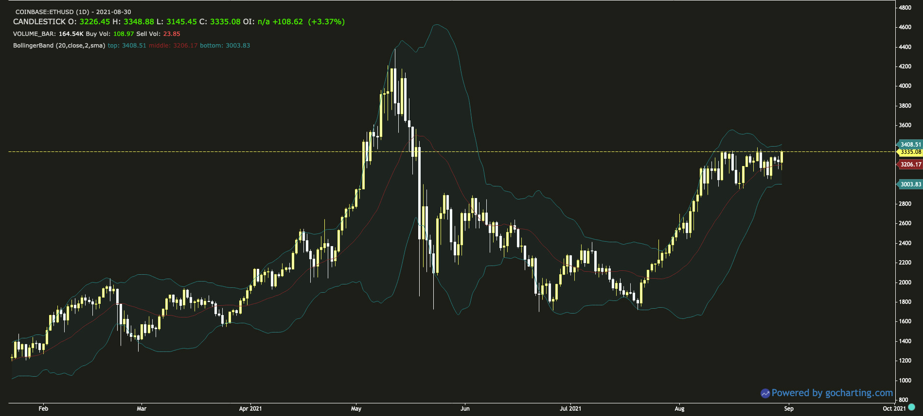 A daily close above the upper Bollinger Band (currently just above $3,400) would give us a 'Bollinger Squeeze' and confirm a breakout to the upside. On the other hand, a daily close below the lower Bollinger Band (currently just above $3,000) would signal a move to the downside.