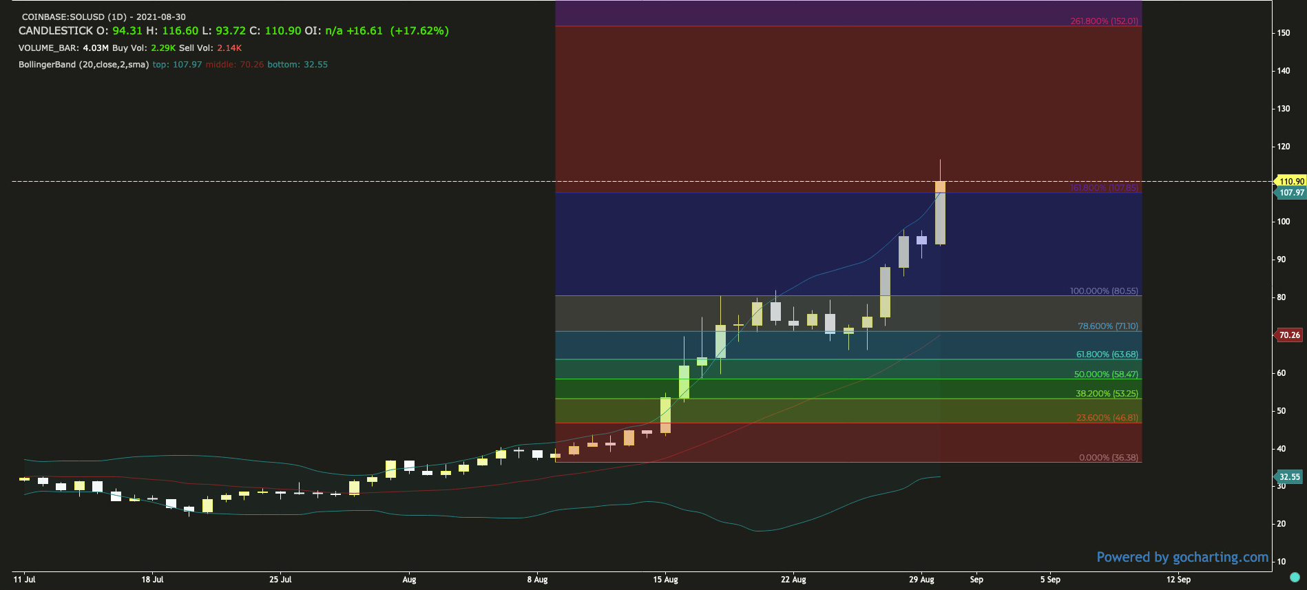 Solana continues to print fresh highs over the past week, reaching an all-time high of $116.84 on August 30th. If the price continues to hold above the Fibonacci extension level at $107.85 (shown on the chart below), then the next target to the upside is $152.01. If the price dives below $107.85, then SOL-USD should find support near the Fibonacci level at $80.55.
