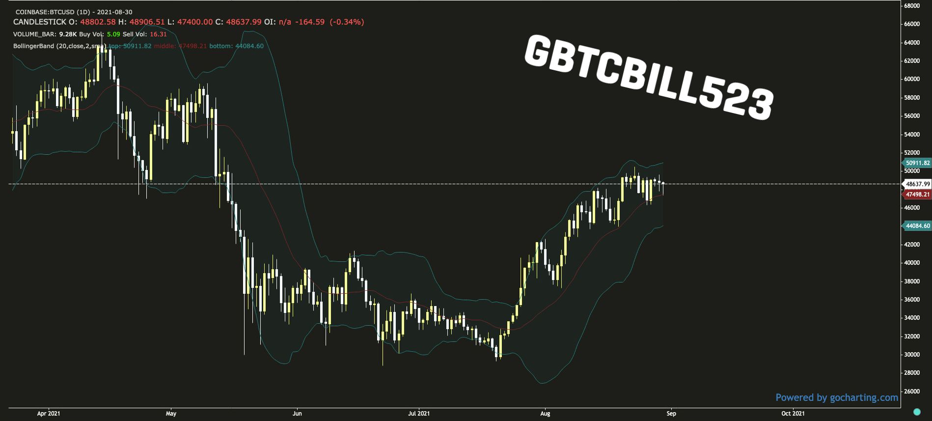 Since closing above the middle Bollinger Band on July 23rd, the price of bitcoin has found support at the middle band several times over the past month or so and currently lies near $47,497. Support is also seen at $46,750, which is where the price bounced from on August 26th, and the at the lower band near $44,000 (shown by the daily chart below).