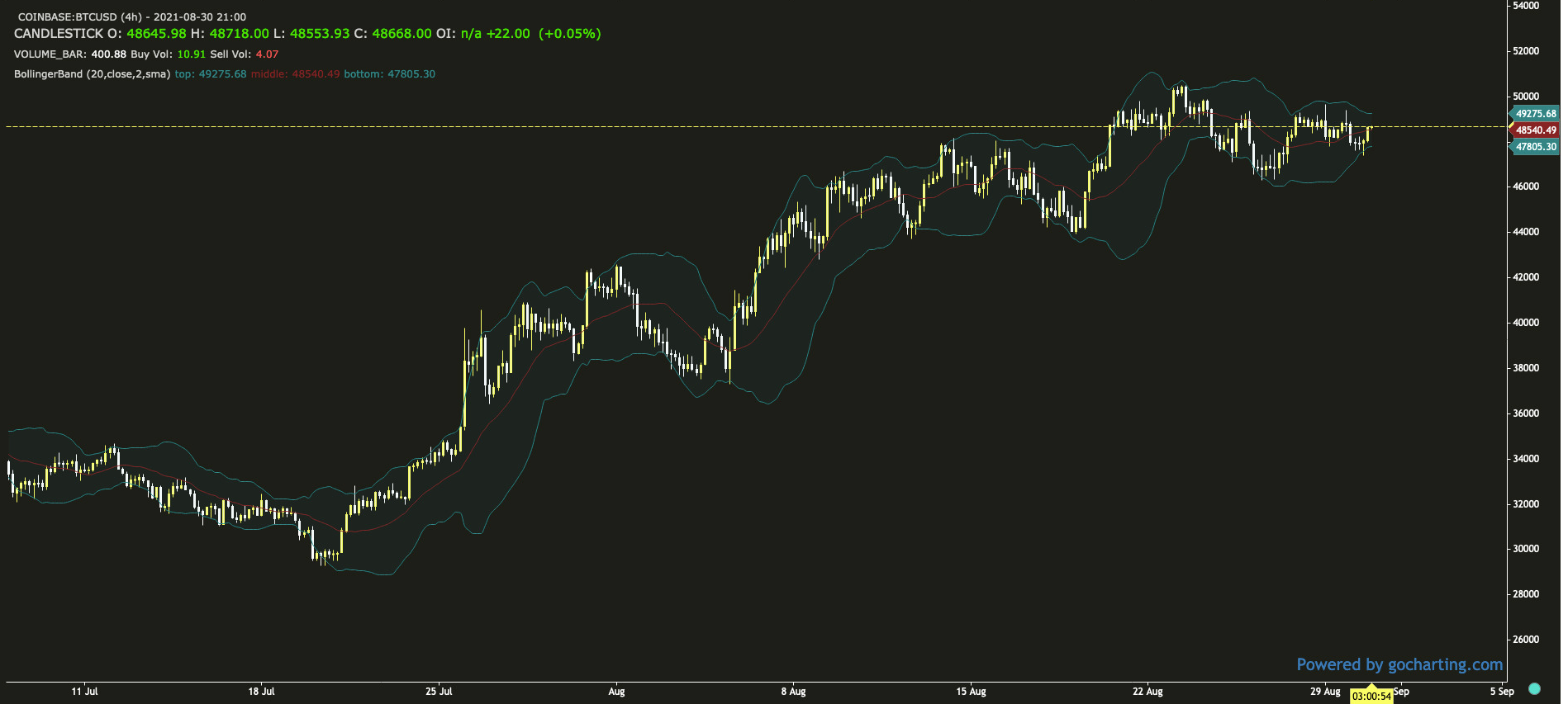 A daily close above the important psychological level at $50,000 is still elusive and we'd want to see BTC-USD take out this level for a bullish outlook. Looking at the 4-hour chart below, we see that the width of the Bollinger Bands is at the lowest level in over a month, suggesting a breakout will happen soon as volatility returns to the market.