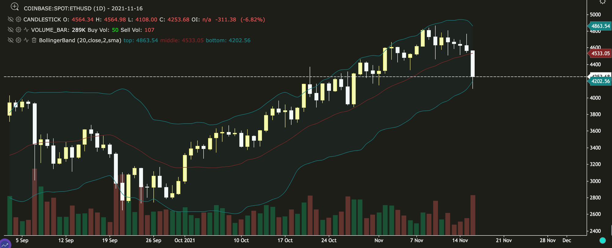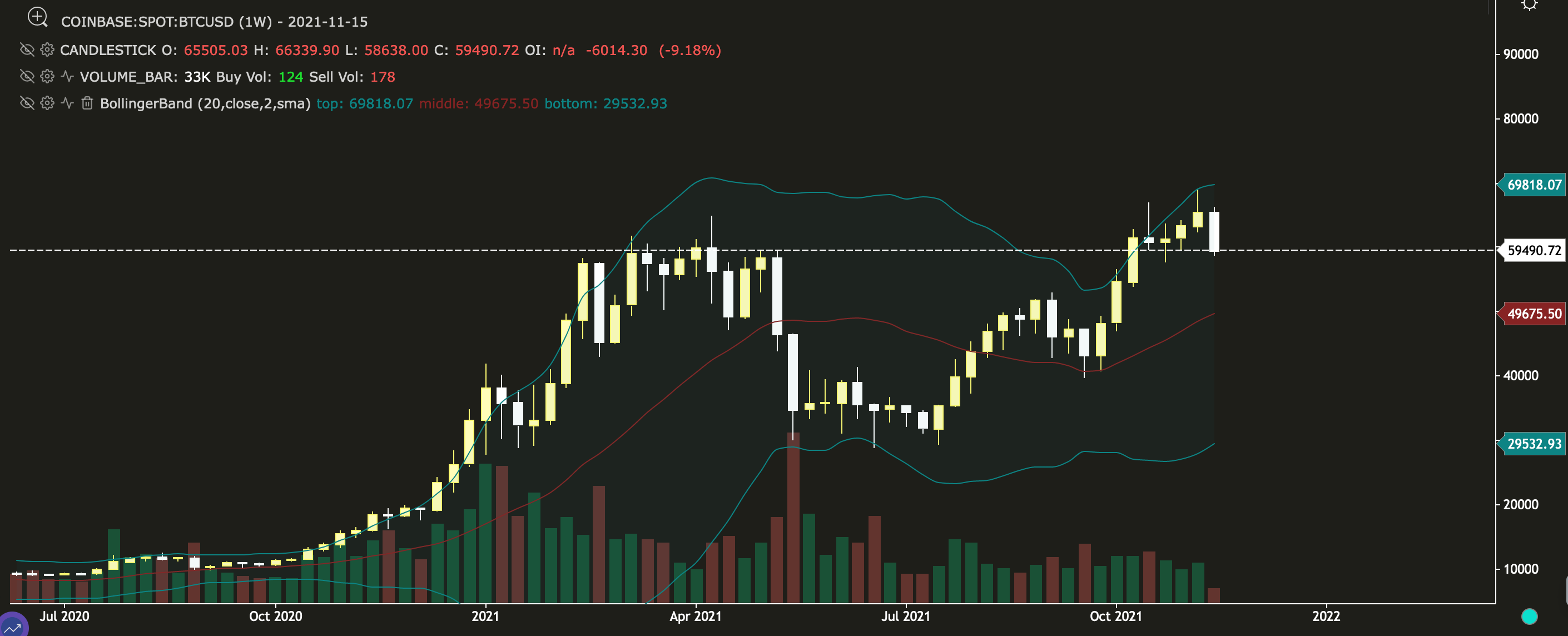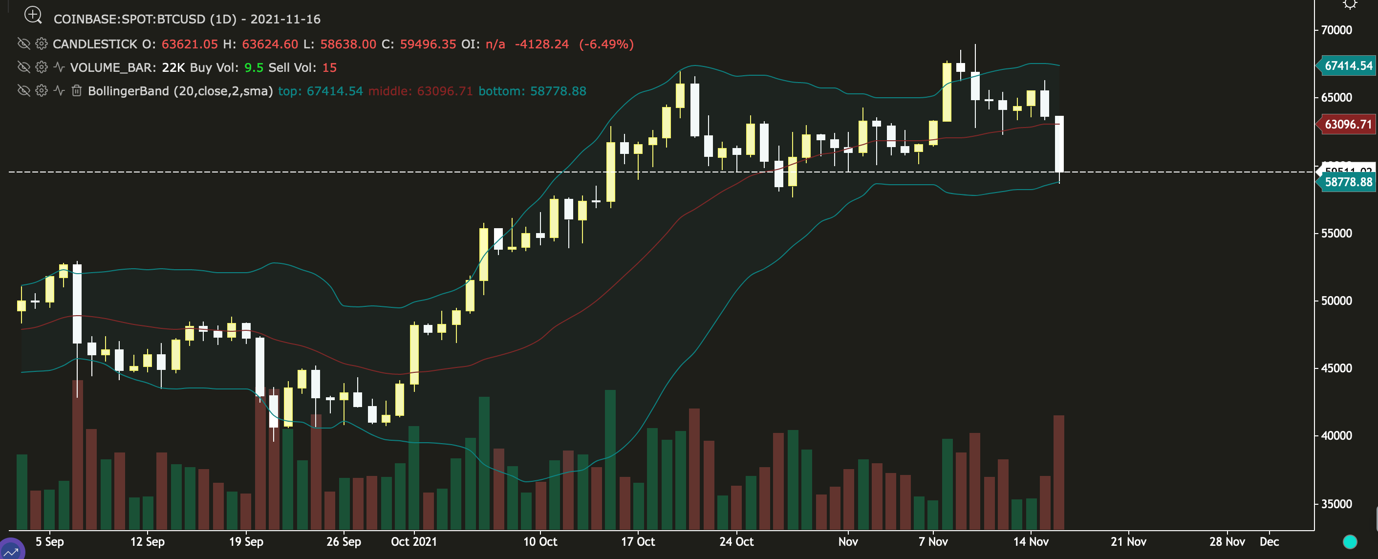 The daily chart for Bitcoin below shows that the price touched the lower band around $58,779 on November 16th and has bounced a little from this price at the time of writing. Volumes have also increased, suggesting there's more interest in a downward move.