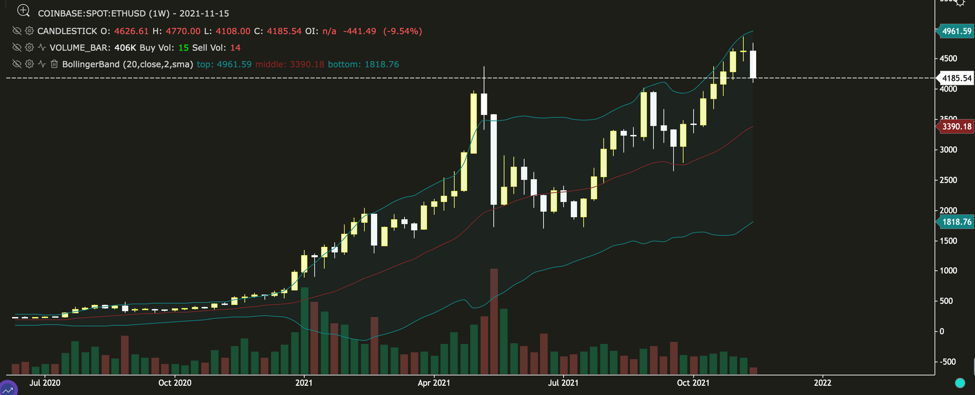 For Ethereum, the outlook on the weekly chart looks similar to Bitcoin, with a bearish candle engulfing the gains made over the past two weeks. If the weekly close is lower than $4,290, then the likelihood of ETH trending towards the middle band at $3,390 increases.