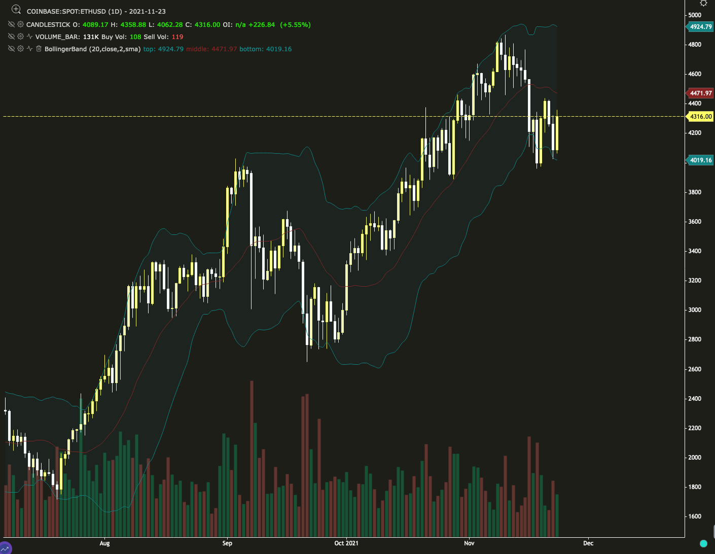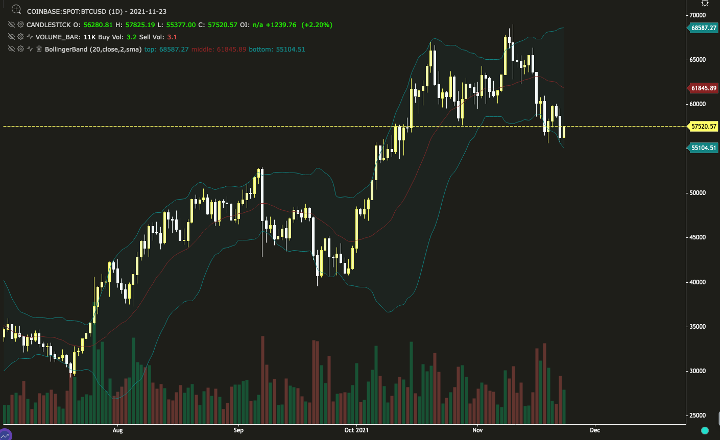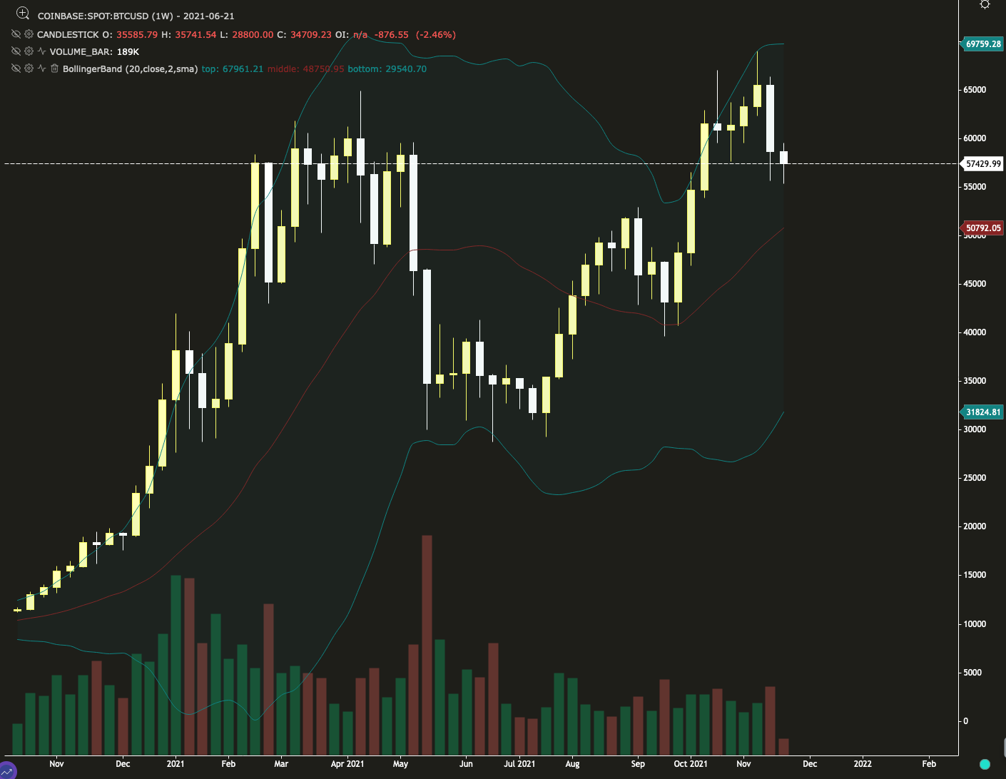 The weekly chart above shows that last week's close engulfed the previous three weeks of gains, suggesting there's a greater likelihood of the market going further south. The middle Bollinger Band currently provides support at $50,729.