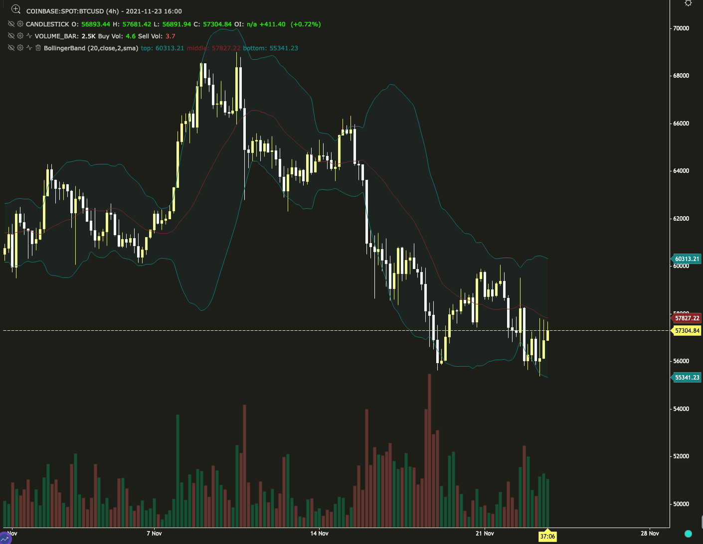 Therefore, as long as we don't see any new lows, we could see a short-term move towards the middle band, currently at $61,845. However, on the 4-hour timeframe, shown below, resistance is seen at the middle band ($57,826) and the upper Bollinger band ($60,313).