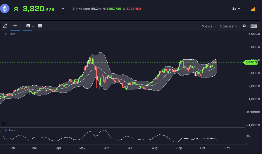 The daily chart for Ethereum below shows that the second largest cryptocurrency retreated from $4,000 and headed down in the days following October 16th. Support is found near $3,560 according to the middle Bollinger Band, while another support zone is currently found near $3,140.