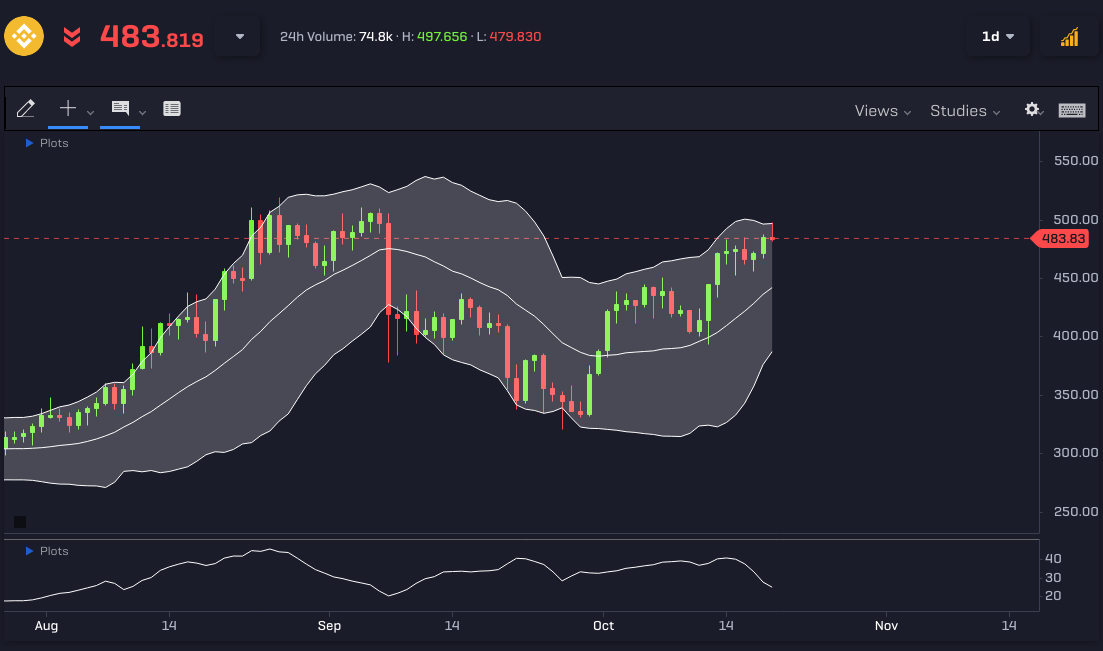 However, the bullish momentum has been cut short at the $500 psychological resistance level. Support is currently found at $441 according to the middle Bollinger Band (shown in the chart above) while further buying interest should be seen at the lower Bollinger Band just under $400.