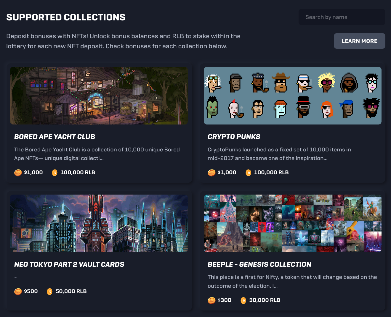 Holders of popular NFT collections such as CryptoPunks, Bored Ape Yacht Club, Beeple Genesis Collection (and others) are eligible for a bonus whenever a unique NFT deposit is made.